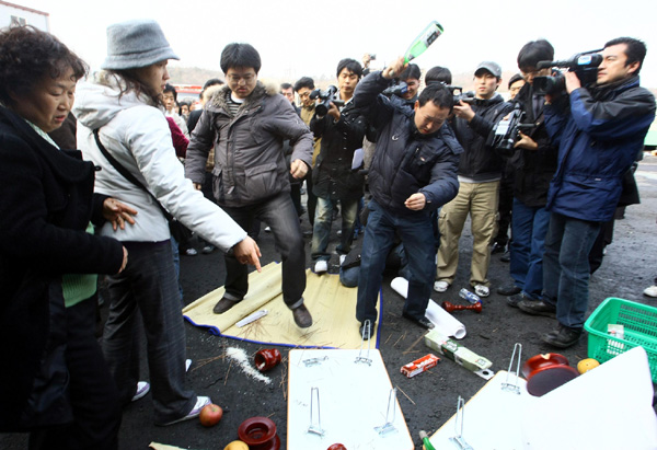 ▲ 9일 경기도 이천시 호법면 유산리 냉동창고 화재 현장을 찾은 희생자 유족들이 추도제 준비가 소홀하다며 현장에 준비된 추도상을 엎고 있다. (사진 =뉴시스) |