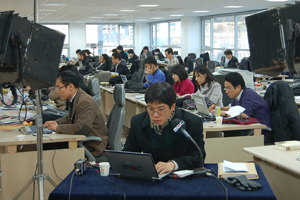 ▲ 18일 삼성 특검 사무실이 차려진 서울 용산구 한남동 고뫄스 빌딩내 기자실에서 각 언론사 법조기자들이 기사를 작성하고 있다. |