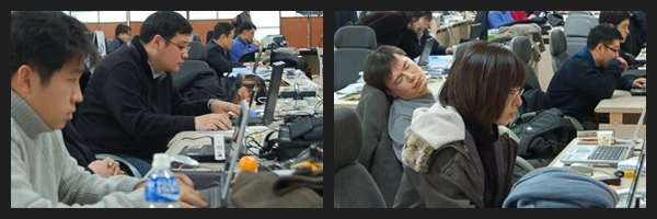 몸과 마음이 지칠 대로 지쳐 있는 상황에서 새해 벽두부터 쌍끌이특검이 나오면서 법조기자들은 거의 패닉상태에 빠져들고 있다. 기자들은 매일 새벽별을 보고 집에서 나와 자정께 퇴근한다. 야근에 걸리면 시내판이 마감될 때까지 특검사무실에서 대기한다. 연일 강행군의 연속이다. 몸에 한계를 느낄 때도 됐건만 그런 사실을 표현하는 것 자체가 언감생심, 입 밖에 낼 일이 못된다. 문화일보 법조팀 한 기자는 “힘들다는 하소연을 토해낼 시간도, 간단한 휴식에 신경 쓸 겨를도 없다”고 말했다.