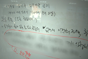 ▲ 삼성 특검 사무실이 차려진 서울 용산구 한남동 고뫄스 빌딩내 비치된 기자실 화이트보드 게시판. 알림 내용이 날림 글씨로 적혀있다. |