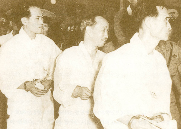 ▲ 1961년 8월28일 민족일보 사건으로 혁명재판에 회부되어 법정에 들어가는 민족일보 사장 조용수와 송지영, 그리고 이종률(왼쪽부터). 연합뉴스 |