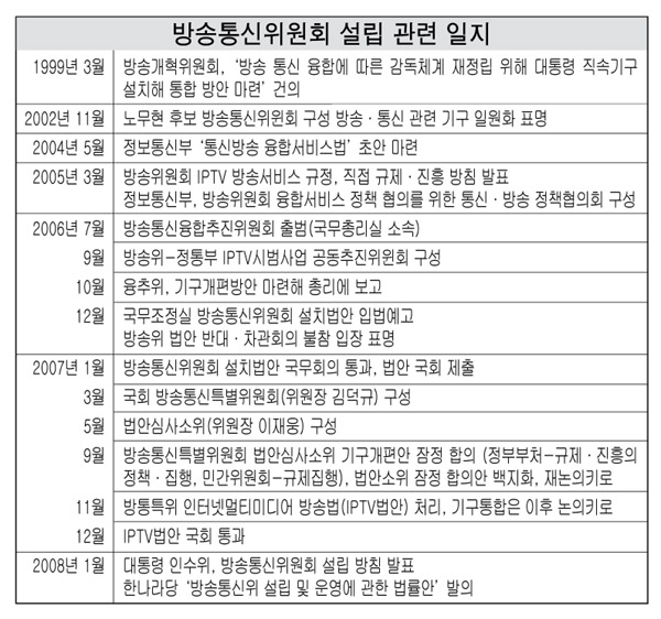 인수위원회가 밝힌 조직개편안대로 ‘방송통신위원회’가 출범하면 방송위원회와 정보통신부가 합쳐지게 된다.