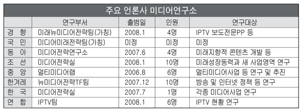 경향신문은 기자 4명으로 구성된 가칭 ‘미래뉴미디어전략팀’(팀장 미정)을 이번 주쯤 발족하고 이르면 다음 달부터 본격 가동할 예정이다. 미래뉴미디어전략팀은 외부 자문 인력 2~3명과 함께 IPTV와 보도전문PP 등 새로운 영역에 대한 연구·검토를 비롯해 종이신문 이외 경쟁력 강화를 위한 방안을 모색할 예정이다.