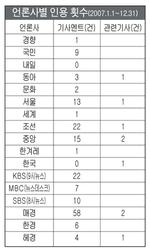 실제 지난 한 해 동안 고 대표의 언론 노출 횟수(각 방송사 메인뉴스)를 살펴보면, 매일경제가 고정칼럼이나 기사 등을 통해 총 60회나 고 대표의 말을 인용했다.