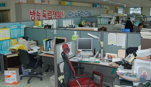 ▲ 방송위원회 노조는 행정자치부가 최근 발표한 직제안에 반발해 13일부터 이틀간 파업을 벌였다. 사진은 14일 파업 중 비어있는 방송위 사무실 전경. |