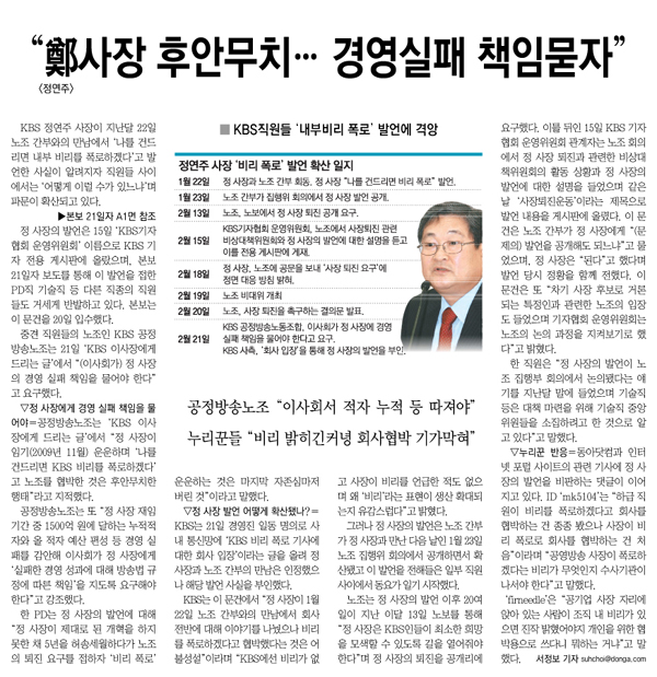 동아는 18일, 21일 사설에서도 KBS와 정 사장 문제를 다루면서 “KBS는 방만한 경영으로 적자를 내면서도 구조조정을 할 생각은 안하고 수신료 인상을 밀어붙이기 위해 온갖 수단을 동원했다”고 썼다. 또 “자리 보전을 위해 버티기와 저질 폭로 협박까지 서슴지 않는 사람이 공영방송 사장이라니 기막힌 일”이라며 “이제 와 남의 탓만 하는 노조도 KBS 부실의 공동책임자”라고 비판했다.