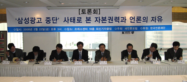 새언론포럼(회장 최용익·MBC 논설위원) 주최 ‘삼성 광고중단 사태로 본 자본권력과 언론의 자유’ 토론회가 22일 오후 프레스센터 18층 외신기자 클럽에서 열렸다.