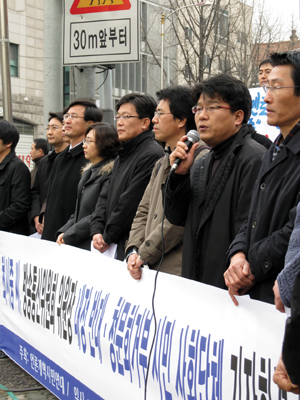 ▲ 4일 오전 서울시 종로구 청운동 청와대 인근서 열린 기자회견에서 언론연대 양문석 사무총장이 발언하고 있다. |