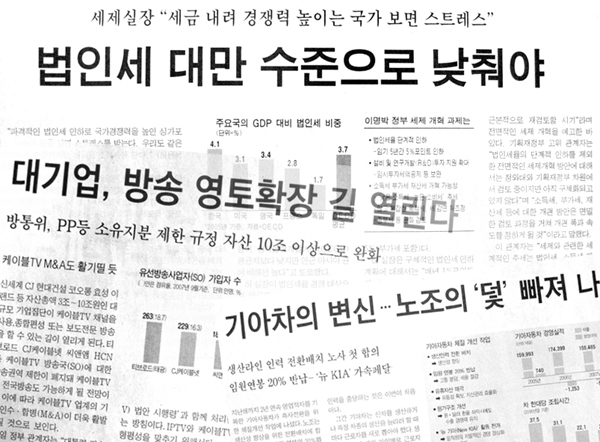 헤럴드경제, 아시아경제, 매일경제 등도 이같은 시각에서 크게 벗어나지 못했다. 게다가 이명박 정부의 감세 정책 등 기업규제 완화 정책에도 찬사를 보내고 있다.