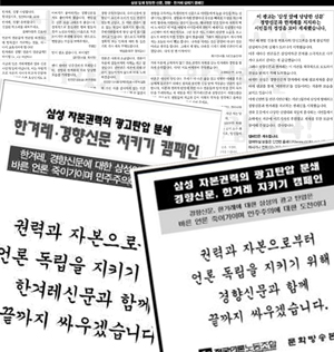 삼성의 광고탄압을 규탄하는 의견광고가 경향신문과 한겨레 지면에 연일 실리고 있다.
