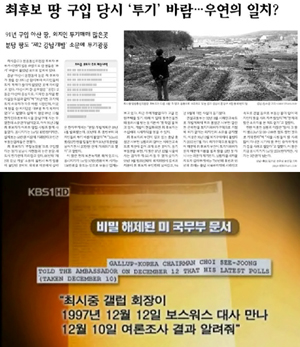 KBS는 이날 뉴스9에서 15대 대선이 열리기 직전인 1997년 12월15일 주한 미 대사관이 미 국무부로 보낸 3급 비밀 문서에 당시 주한 미 대사였던 보스워스가 최시중 당시 한국갤럽 회장이 만나 말해준 대선후보들의 여론조사 결과가 기록돼 있었다고 밝혔다.