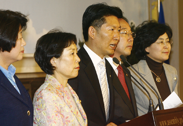 ▲ 통합민주당 문화관광위원회 소속 윤원호, 강혜숙, 정청래, 이광철, 유승희 의원(왼쪽부터)이 18일 국회 정론관에서 기자회견을 열어 유인촌 문광부장관의 공공기관장 사퇴압력을 비판하고 있다. (연합) |