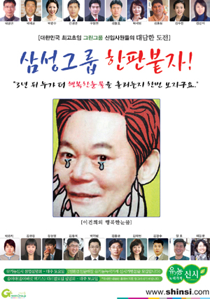 이 광고는 삼성그룹에서 문제가 되고 있는 로이 리히텐슈타인의 ‘행복한 눈물’을 패러디한 작품 속에 이건희 회장이 눈물을 흘리고 있으며 “3년 뒤 누가 더 행복한 눈물을 흘리는지 한 번 보자구요!”라는 문구가 적혀 있다.
