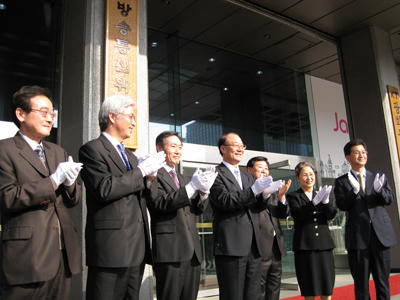 ▲ 신임 최시중 방송통신위원장과 새로 임명된 방통위원들이 26일 구 정보통신부 건물에 들어선 방송통신위원회 앞에서 열린 현판식 행사에서 박수를 치고 있다. |