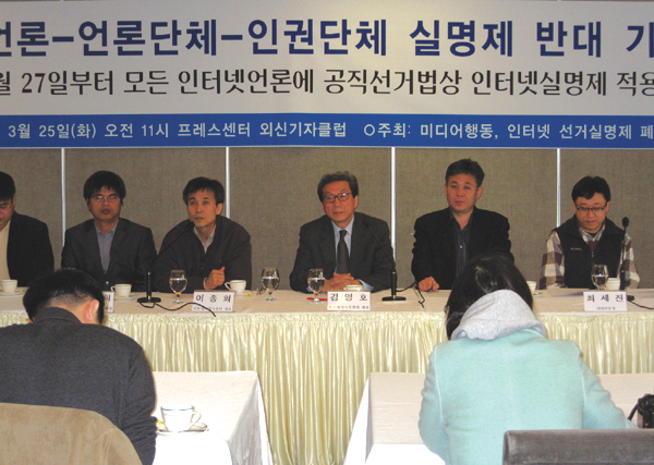 인터넷기자협회, 언론개혁시민연대 등 28개 인터넷언론 및 시민사회단체로 구성된 ‘언론사유화저지 및 미디어공공성 확대를 위한 사회행동’과 ‘인터넷 선거 실명제 폐지 공동대책위’는 25일 서울 프레스센터 18층 외신기자클럽에서 ‘인터넷실명제 반대 기자회견’을 열고 인터넷실명제 폐지를 촉구했다.