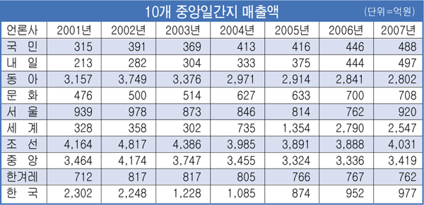 조선일보가 2001년부터 7년 연속 매출 부동의 1위를 지켰다. 7년간 조선의 평균매출액은 4천1백66억원, 중앙 3천5백60억원, 동아 3천1백16억원, 한국 1천3백80억원, 세계 1천2백2억원, 서울 8백76억원, 한겨레 7백78억원, 문화, 5백94억원, 국민 4백5억원 등이었다.