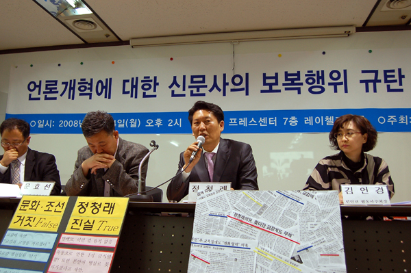 ▲ 정청래 통합민주당 의원이 지난 14일 언론개혁시민연대 주최로 서울 프레스센터에서 열린 ‘언론개혁에 대한 신문사의 보복행위 규탄 기자회견’에 참석해 발언하고 있다. |