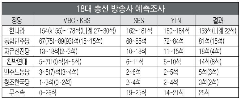 얼마나 틀렸나방송사들은 선거 당일인 9일 오후 6시 ‘한나라당 과반 획득 확실’이라고 보도했다. 예측치를 넓게 잡은 MBC와 KBS는 한나라당 의석수를 정확히 맞추지 못했고 SBS와 YTN은 아예 1백60석대로 잡아 근접하지도 못했다.