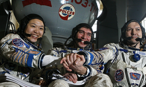 ▲ 동아사이언스 기자들은 고산씨가 아닌 이소연씨가 러시아의 정식 탑승우주인 2명과 훈련을 받은 사진을 이상하게 여겨 취재에 들어갔다. 3월 7일을 전후로 모스크바 발 로이터 사진에는 이소연씨가 두 우주인과 훈련하는 장면이 포착됐다. 사진은 3월 18일 러시아 모스크바 인근 가가린우주인훈련센터에서 이소연씨가 세르게이 볼코프, 올레그 코노넨코씨와 훈련중 악수를 나누고 있다. ⓒ연합뉴스 |