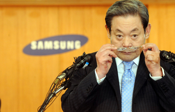 | ▲ 이건희 삼성그룹 회장이 22일 오전 삼성그룹 본관 지하1층 국제회의실에서 삼성그룹 경영쇄신안을 발표하며 그룹 일선에서 물러나기로 했다고 발표하며 안경을 고쳐쓰고 있다. ⓒ뉴시스 | ||