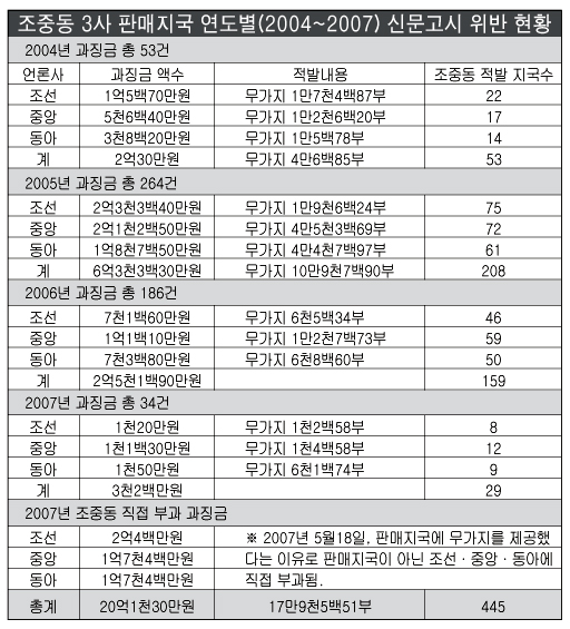 이 기간 조·중·동은 총 5백37건 중 4백45건의 신문고시 위반으로 85%의 비율을 보였다. 신문사별 과징금은 조선일보 6억2천4백90만원, 중앙일보 5억5천5백30만원, 동아일보 4억8천4백만원 순이었다. 한겨레는 1천7백20만원, 경향은 1천2백만원의 과징금을 물었다.
