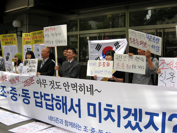 네티즌과 함께하는 조 중 동 왜곡보도 규탄 기자회견이 민주언론시민운동연합 관계자, 네티즌 등 20여명이 참석한 가운데 6일 오전 서울 중구 조선일보 코리아나 호텔 앞에서 열렸다.