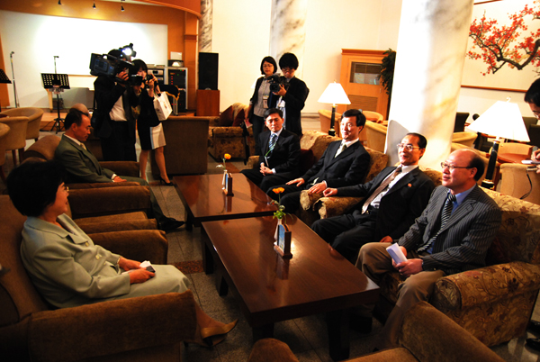 ▲ 8일 오후 금강산 호텔 로비에서 남북언론인 대표자회의에 앞서 남측 김경호, 정일용, 양승동 언론본부 공동대표와 북측 조충한 언론분과위 부위원장, 정명순 홍동철 언론분과위원이 환담하고 있다. |
