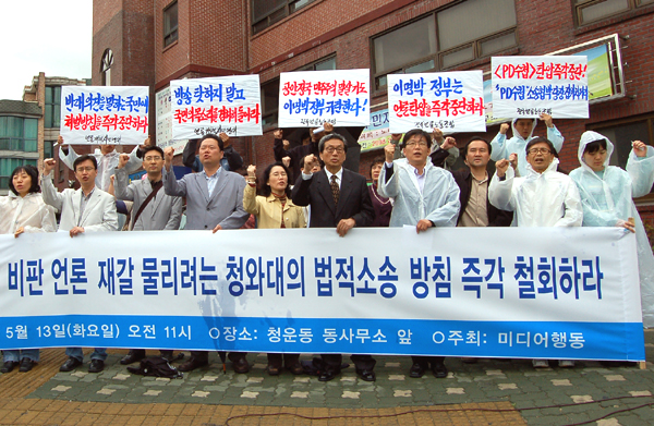 ‘언론 사유화 저지 및 미디어 공공성 확대를 위한 사회행동’은 13일 청와대의 PD수첩 고발 방침은 비판 언론에 재갈을 물리려는 시도라며 즉각 철회하라고 요구했다.