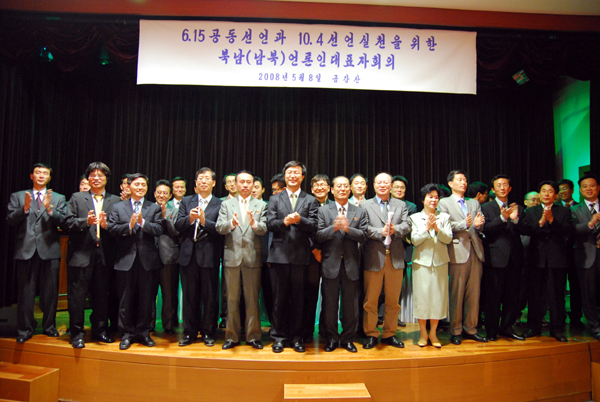 ▲ 지난 8일 남북언론인 대표자회의 결의문 낭독후 남북언론인들이 이를 환영하는 박수를 치고 있다. |