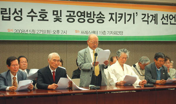 백기완 통일문제연구소 소장을 비롯한 각계 인사 1백51명은 27일 서울 태평로 프레스센터 ‘공영방송 독립성 수호 및 공영방송 지키기’ 선언 기자회견을 갖고 공영방송의 독립성을 수호해야 한다고 밝혔다.