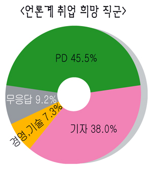 희망 직종에서는 PD(45.5%)가 기자(38.0%)보다 앞섰다. PD 희망자들 가운데 54.6%가 예능·드라마PD를 원했다. 시사교양(24.6%), 라디오(13.5%), 편성(5.3%) 순이었다.