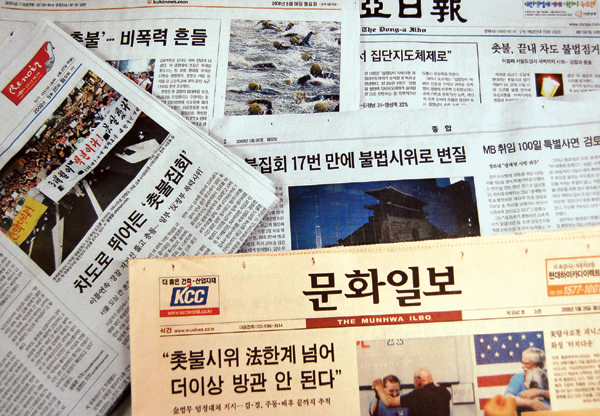 경향·한겨레·한국 “민주주의 역행” 그러나 한겨레 경향 한국 등은 이들 신문의 불법집회 주장과 배후설이 근본적으로 한계가 있다고 비판했다. 시민들이 거리로 뛰쳐나간 것은 정치적 선동 때문이 아니라 귀를 막은 정부·보수언론 탓이라는 주장이다.