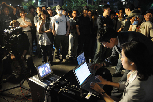 ▲ 촛불집회 현장에서 '뉴스특보' 준비하는 MBC / 1일 오후부터 시작된 미국산 쇠고기 수입에 반대하는 시위가 2일 새벽까지 계속 진행되고 있는 가운데 경찰과 시위대간의 대치 상황이 계속되고 있다. ⓒ뉴시스 |