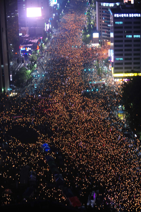 | ▲ 거리를 가득 메운 시민들의 촛불 / 7일 저녁 서울광장에서 출발한 '72시간 릴레이 촛불문화제' 참가자들이 명동 방향으로 행진을 하고 있다. ⓒ뉴시스 | ||