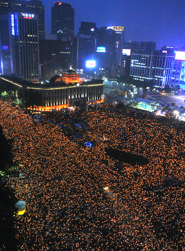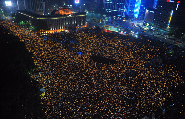 | ▲ 최대인파 몰린 촛불문화제 / '72시간 릴레이 국민행동' 미국산 쇠고기 수입 반대 촛불 문화제 삼일째인 7일 오후 참가자들이 촛불을 들고 서울광장을 가득 메우고 있다. ⓒ뉴시스 | ||