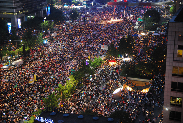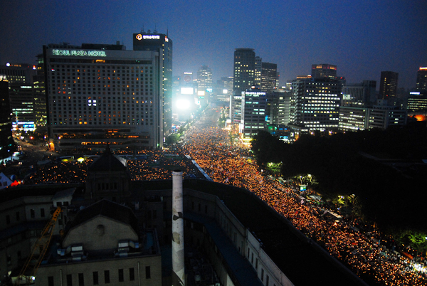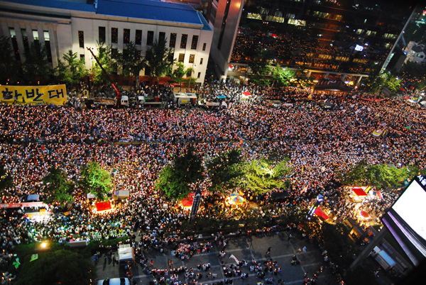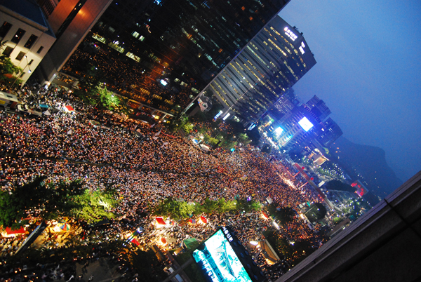 | ▲ 6·10 촛불행진이 열리고 있는 서울 시청 앞 세종로 거리(프레스센터에서 본 모습) | ||