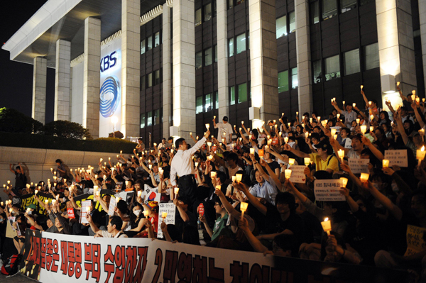 | ▲ 13일 저녁 서울 KBS 본관 앞에서 '미국산 쇠고기 수입 반대 및 수입조건 재협상 촉구 촛불문화제'에 참가한 시민들이 촛불을 밝히고 있다. ⓒ뉴시스 | ||