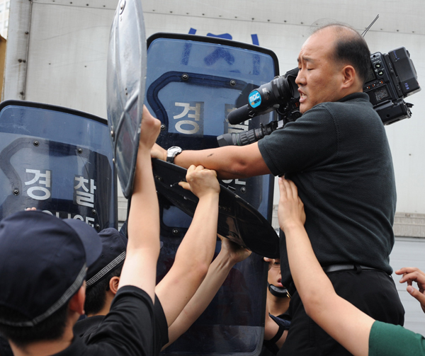 | ▲ / 방패로 막는 카메라 렌즈 / 29일 태평로에서 전경들이 촛불집회 차량견인 현장을 취재하던 MBC 카메라기자의 카메라를 막고 취재를 방해하고 있다. ⓒ뉴시스 | ||