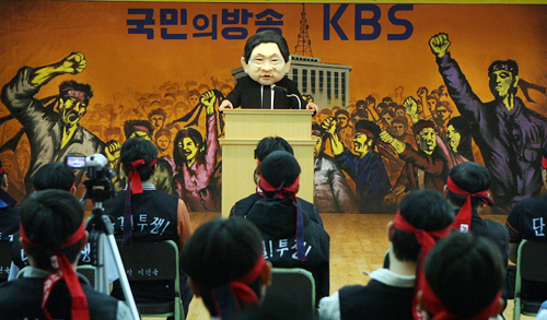 ▲ / KBS노조, 정연주 사장 퇴진 촉구 / 지난 4월 전국언론노동조합 KBS 본부 주최로 22일 서울 여의도 KBS 본관 민주광장에서 열린 '방송구조 개편 대응 등 공영방송 사수를 위한 비상대책위원회' 출범식에서 정연주 사장의 모형이 축사를 하는 퍼포먼스를 하고 있다. ⓒ연합뉴스 |