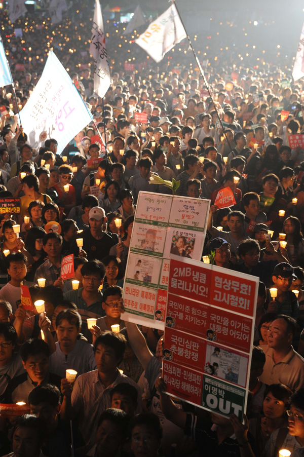 | ▲ / 하나의 촛불이 모여 거대한 바다 / 5일 저녁 서울시청 광장과 일원 도로에서 수많은 시민들이 모여 미국산 쇠고기 수입 장관 고시 철회 및 재협상을 촉구하는 촛불집회를 하고 있다.ⓒ뉴시스 | ||