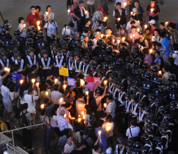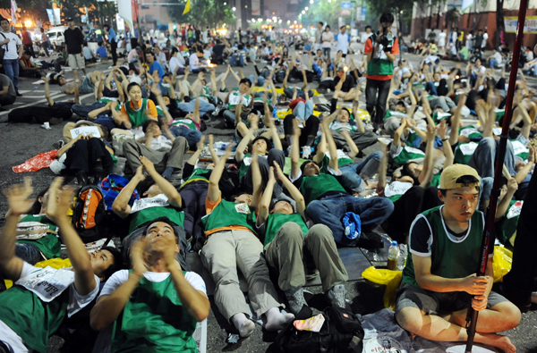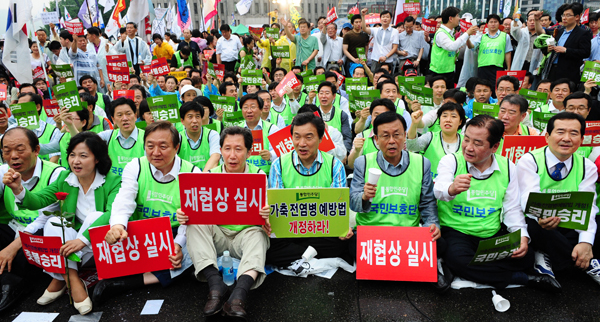 | ▲ / 구회 외치는 통합민주당 / 5일 오후 서울시청 앞 광장에서 시민사회단체와 종교계, 야당 및 노동계 등이 참여한 가운데 열린 '7.5 국민승리선언 범국민촛불대행진'에 참석한 통합민주당 의원들이 구호를 외치고 있다. ⓒ뉴시스 | ||