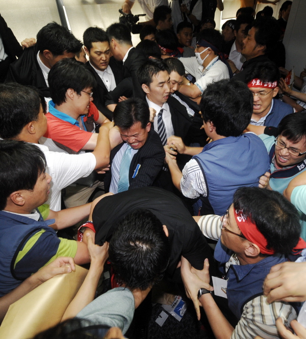 이에 따라 조합원과 진행요원들은 30여분간 격렬한 몸싸움을 벌였으며 이 과정에 한 기자가 다쳐 병원에 실려 가는 일도 발생했다.