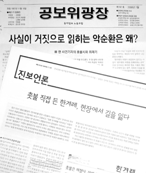 “촛불로 대변되는 국민의 분노를 동아일보가 외면하고 있다.” “한겨레가 촛불인지, 촛불이 한겨레인지 모르겠다.” 촛불집회 보도의 대척점에 섰던 동아일보와 한겨레 기자들이 최근 공보위 소식지를 통해 각각 자사 보도를 비판하고 나서 주목을 받고 있다.