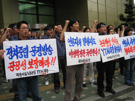 | ▲ YTN 노조(위원장 박경석) 조합원 50여명이 18일 서울 남대문로 YTN 사옥 후문에서 "구본홍 사장 물러가라"고 구호를 외치며 농성하고 있다. | ||