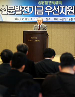 ▲ 지난 1월 10일 오후 서울 한국프레스센터에서 열린 ‘2008년도 신문발전기금 우선지원대상 사업설명회’에서 신문발전위원회 장행훈 위원장이 인사말을 하고 있다.(뉴시스) |