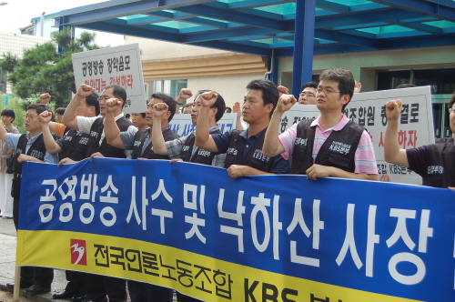 전국언론노동조합 KBS본부(위원장 박승규)는 30일 서울 청와대 인근 청운동에서 기자회견을 열고 이명박 정권이 KBS에 낙하산 사장을 내려보낸다면 KBS 구성원들의 극단적인 저항을 맞게 될 것이라고 주장했다. 이날 기자회견에는 KBS 경영인협회, 기술인협회, 기자협회, 프로듀서협회 등 직능단체들도 함께 했다.