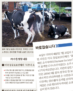 사진 설명에는 “올해 1월 말 동물보호단체인 ‘휴메인 소사이어티’가 공개한 다우너(주저앉은)소 동영상. 원래 동물 학대를 고발한 영상이었지만 PD수첩은 광우병에 걸린 소처럼 보도했다”고 전했다.
