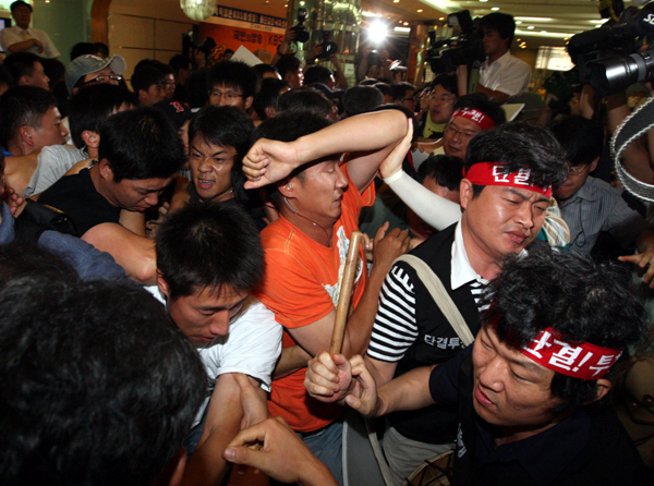 ▲ 8일 KBS 이사회가 임시이사회를 열어 정연주 사장에 대한 해임제청안을 의결하기로 한 가운데 이날 오전 서울 여의도 KBS 본관 로비에서 진입하려는 사복경찰들과 막아서는 KBS노조원이 충돌하고 있다.(연합뉴스) |