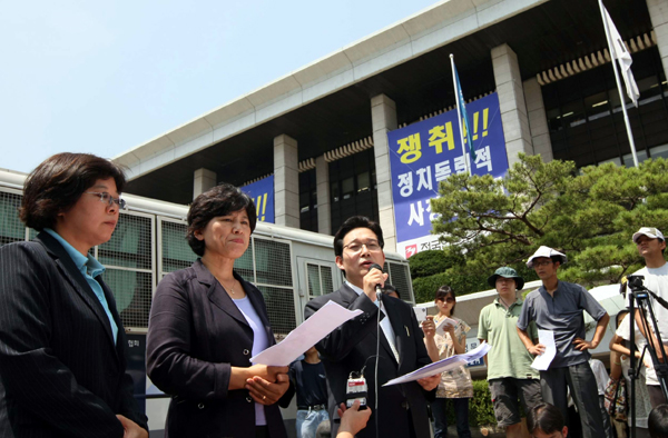 ▲ 8일 KBS이사회의 `정연주 사장 해임제청안' 처리문제와 관련 이지영, 남윤인숙, 이기욱 이사(왼쪽부터)가 이사회장을 퇴장한 뒤 방송국 앞에서 `방송장악·네티즌탄압저지 범국민행동' 소속 회원들이 주최한 기자회견장에 참석해 발언을 하고 있다.(연합뉴스) |