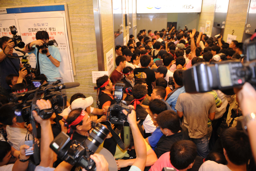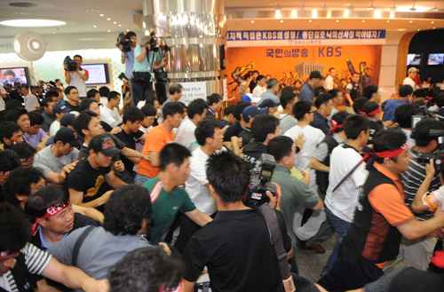 | ▲ 경찰은 KBS 민주광장에서 나가 주시요 / 8일 오전 여의도 KBS 본관 제1회의실에서 정연주 사장의 해임 제청에 대한 KBS 이사들의 임시이사회가 열리고 있는 가운데 로비 민주광장을 점령한 사복경찰들에게 노조원들이 나가라는 요구에 고개를 수그리고 앉아 있다. ⓒ뉴시스 | ||